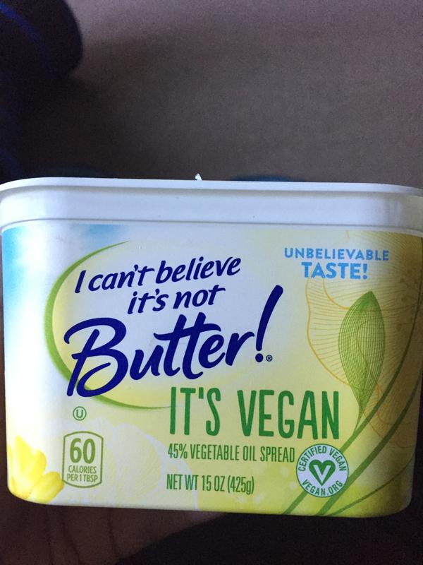 I CAN'T BELIEVE IT'S NOT BUTTER...138301 volume to weight conversion A food with a name containing, like or similar to I CAN'T BELIEVE IT'S NOT BUTTER!, 45% VEGETABLE OIL SPREAD, IT'S VEGAN, UPC: 040600000055: I CAN'T BELIEVE IT'S NOT BUTTER!, 45% VEGETABLE OIL SPREAD, IT'S VEGAN, UPC: 040600721394 contain(s) 429 calories per 100 grams (≈3.53 ounces) [ price] About this page: Weight of I CAN'T BELIEVE IT'S NOT ...