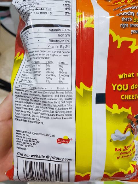 Cheetos ingredients label. CHEETOS® Baked Crunchy Cheese Flavored Snacks | FritoLay CHEETOS® Baked Crunchy Cheese Flavored Snacks | FritoLay Frito-Lay's line of Baked snacks are baked, not fried, to give you the great taste you've come to love with Frito-Lay snacks. On top of that, Baked snacks offer less fat than regular potato chips 1, cheese-flavored snacks 2, and tortilla chips 3. 1 65% less fat than regular potato chips SmartLabel Products | SmartLabel Cheetos. Cheetos, Asteroids, Cheddar Flavored, Cheese Flavored Snacks, 30 Individual 1/2 OZ, Bags (Total Net Wt 15 OZ (425.2 g)) PepsiCo, Inc. Cheetos. Cheetos, Bag Of Bones, Flamin' Hot & White Cheddar Flavored, Cheese Flavored Snacks, Net Wt 14 OZ (396.9 g), Canister. PepsiCo, Inc. Are Cheetos Gluten-free? - Rachael Roehmholdt According to the Frito Lay company, some flavors or their Cheetos are gluten-free, and others contain no gluten-containing ingredients. The difference here is that those labeled gluten-free have been confirmed to contain less than 20ppm of gluten, the amount required by the FDA to have this label on their packaging. Cheetos Crunchy cheese-flavored snacks Nutrition Facts & Calories CALORIC RATIO PYRAMID™ This graphic shows you what percentage of the calories in a food come from carbohydrates, fats, proteins, and alcohol. If you are trying to achieve a specific distribution of calories, such as the 40/30/30 distribution of the Zone™ diet, or the more traditional 60/30/10 distribution, the Caloric Ratio Pyramid™ will show you how recipes, meal plans, or individual ...