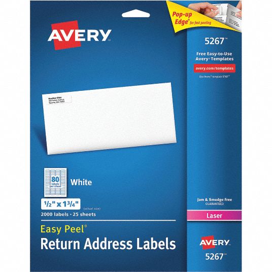 I can't make my labels print out to fit an Avery template When I want to make labels - I select the Avery 5267 template. I type in my information (like names and addresses), but then when I print them out they don't fit the actual label sheet. The first row of labels is maybe OK, but then the next row is printed too close or too far apart and the info misses the actual position of the next row of labels. Amazon.com: AVERY 5267 Easy Peel Return Address Labels, Laser, 1/2 x 1 ... Avery Printable Shipping Labels with Sure Feed, 3-1/3" x 4", White, 600 Blank Mailing Labels (5164) $25.98 ($0.04/Count) avery labels 5267 white presta 94203 80 up labels labels 80 per sheet mini return address labels 2 x 1 label avery laser blank avery labels From the manufacturer Avery labels. So easy to use. Avery labels won't fall off. Avery Templates Avery Design & Print Online Easily create custom labels, cards and more Choose from thousands of professional designs and blank templates Personalize with custom fonts, colors and graphics Quickly import contacts or data with mail merge Save projects online or to your computer Learn More Watch a quick demo to see how it's done! clear - Grainger Looking for Laser Label, 1/2" H, 1-3/4" W, PK25? Find it at Grainger.com®. With over 1.6M products and 24/7 customer service we have supplies and solutions for every industry. ... Item Laser Label; Avery Template Number 5,267; For Use With Laser; Label Height 1/2 in; Label Width 1 3/4 in; Color White; Adhesive Permanent; Material Paper ...