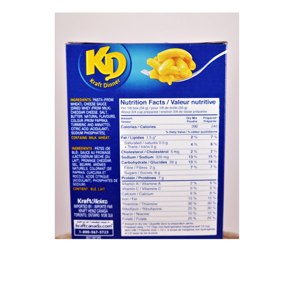 Original Cup 2.05 oz | Kraft Macaroni & Cheese enriched macaroni product (wheat flour, glyceryl monostearate, niacin, ferrous sulfate [iron], thiamin mononitrate [vitamin b1], riboflavin [vitamin b2], folic acid); cheese sauce mix (whey, corn syrup solids, milk, palm oil, milk protein concentrate, modified food starch, milkfat, salt, maltodextrin, contains less than 2% of calcium carbonate, … | Kraft Macaroni & Cheese Kraft Macaroni & Cheese ... checkbox label label. Apply Cancel. Confirm My Choices. Allow All. By clicking "Accept All Cookies", you agree to the storing of cookies on your device to enhance site navigation, analyze site usage, and assist in our marketing efforts. Kraft Kraft Dinner Calories and Nutritional Information - FatSecret Kraft Dinner Snack Cups . per 1 cup (58g) - Calories: 220kcal | Fat: 4.00g | Carbs: 40.00g | Prot: 7.00g ... If you can't find the item you're looking for, please help out by adding a new item to the food database. Click here to contribute. Get the app Brand List Contact Us. Find people ... Calories in Kraft Kraft Dinner and Nutrition Facts - FatSecret Kraft Kraft Dinner Nutrition Facts Serving Size 1/4 box (56 g) Amount Per Serving Calories 240 % Daily Values* Total Fat 2.00g 3% Saturated Fat 1.000g 5% Trans Fat - Cholesterol 5mg 2% Sodium 410mg 18% Total Carbohydrate 40.00g 15% Dietary Fiber 1.0g 4% Sugars 7.00g Protein 7.00g Vitamin D - Calcium - Iron - Potassium -