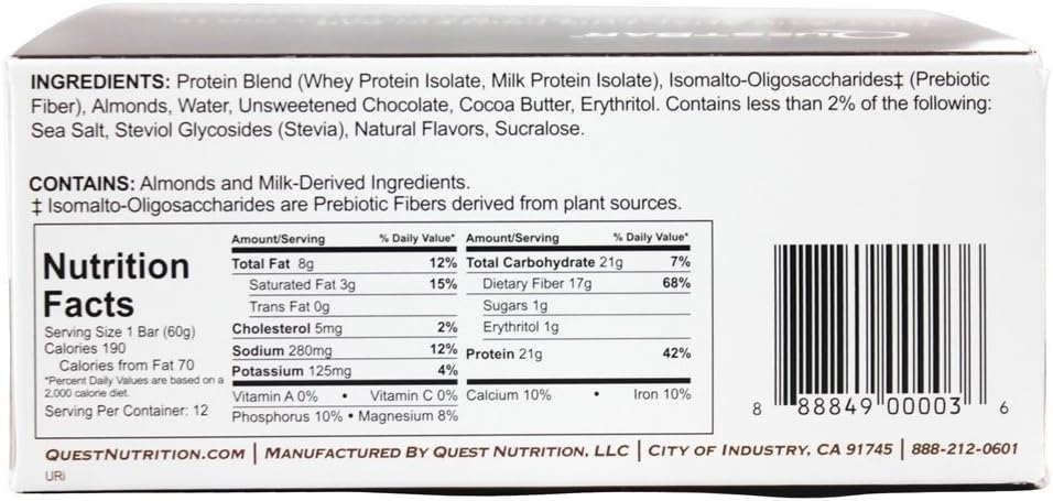Quest Protein Bars 12/Box | All Flavors - Best Price Nutrition Quest Bars are also made with a protein blend of milk protein isolate and whey protein isolate and other ingredients you can read like almonds and chocolate! Quest Bar Nutrition Label & Supplement Facts. Serving Size: 1 Bar. Servings Per Container: 12. Calories 190. Total Fat 7g. Saturated Fat 2g. Trans Fat 0g. Cholesterol 5mg. Sodium 210mg ...