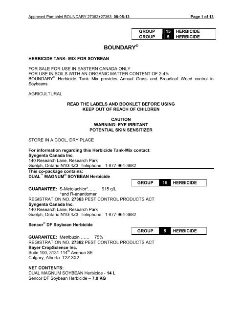 PDF BOUNDARY LQD HERBICIDE - Syngenta Label . 15 HERBICIDE GROUP 5 HERBICIDE . Approved BOUNDARY LQD Herbicide 30812 2020-10-02 Page 2 of 18 1.0 NOTICE TO USER This pest control product is to be used only inaccordance wit h the directions on the label. It is an offence under the Pest Control Products Act to use this product in a way that is inconsistent