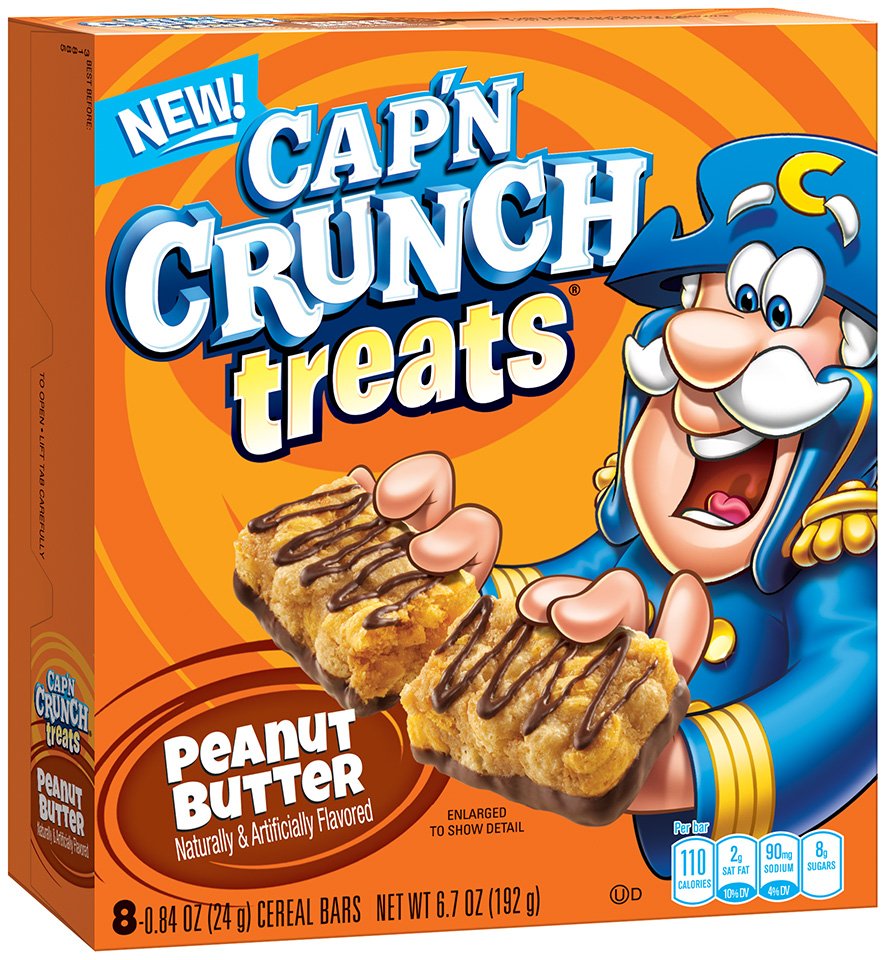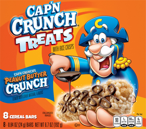 We’re sorry, this recipe is currently unavailable. Sep 30, 2022 · By clicking “Accept All Cookies”, you agree to the storing of cookies on your device to enhance site navigation, analyze site usage, and assist in our marketing efforts. Cap'n Crunch Treats Cereal Bars Peanut Butter - 8 ct Details. Treats with rice crisps. Per Bar: 90 calories; 1 g sat fat (4% DV); 90 mg sodium (4% DV); 6 g total sugars. Flavor with other natural flavors. Visit on facebook/capncrunch. Instagram (at)realcapncrunch. Follow the cap'n on Twitter (at)realcapncrunch. SmartLabel: Scan here for more food information or call 1-800-856-5781. Visit us at ...