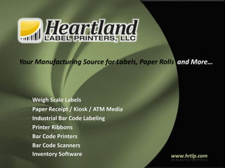 Services | Heartland Labels Inc At Heartland Labels we'll make and ship nationwide any self-adhesive labels and stock products you need. Our current product options are listed below, but we're always willing to expand. If you have questions or need help deciding what options are right for you simply contact our sales team. We'd be more than happy to work with you.