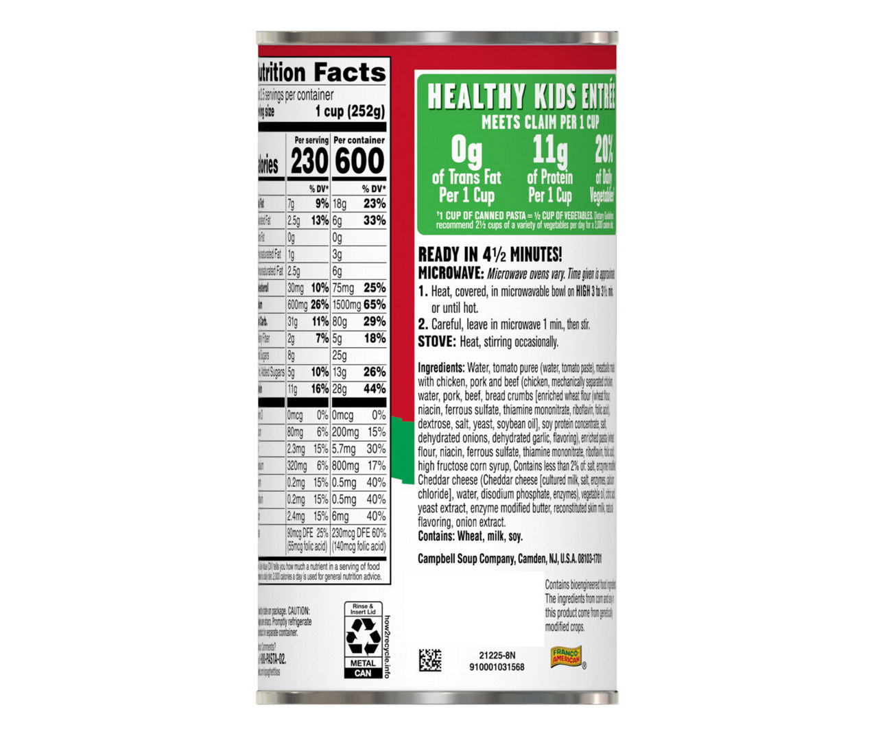 Spaghettios with meatballs nutrition label